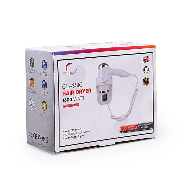 This commercial wall-mounted hair dryer features a powerful 1600W long-life motor, designed for durability and reliable performance in hotel guest rooms. It delivers strong, consistent airflow for fast and efficient drying, helping guests save time. The built-in night light adds convenience in low-light settings, while the ultra-quiet operation ensures a peaceful experience. For added safety, it includes overheating circuit protection. The space-saving wall-mounted design keeps it within easy reach, and the anti-theft cord secures it in place to prevent removal. Easy to install and built for heavy use, this dryer is a practical and secure choice for hospitality environments.